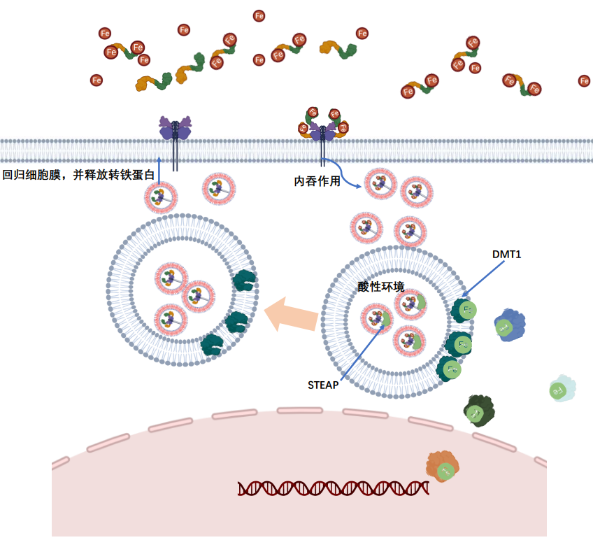 转铁蛋白负责运载由消化管吸收的铁和由红细胞降解释放的铁。以三价铁复合物(TF-Fe3+)的形式进入骨髓中,供成熟红细胞的生成。转铁蛋白(TF)结合铁是通过与其受体,即Transferrin Receptor 1(TFR1)相互作用而实现的。TFR1 是一种表达于细胞表面的糖蛋白,由两个同源二聚体的亚基通过二硫键连接而成。在细胞表面,TF与Fe3+相互作用形成全铁-TF,并与TFR1受体结合,在细胞内吞作用下进入核内体。在偏酸性核内体的环境中,Fe3+与TF分离,同时前列腺蛋白(STEAP)将Fe3+还原为Fe2+,并被二价金属离子转运蛋白1(DMT1)转运到细胞质中,然后释放了Fe3+的TF与TFR1组成TF/TFR1复合物,通过胞吐作用回游到细胞表面。在细胞表面,转铁蛋白(TF)与受体TFR1分离,成为脱铁-TF,然后再与Fe3+重新结合参与铁循环。整个过程完成后TF和TFR1被循环利用,进入细胞摄取铁的下一个周期中。
