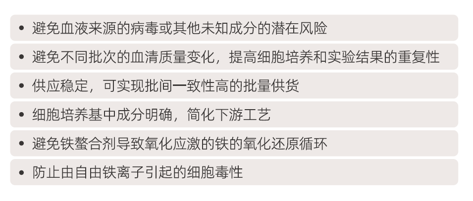 传统的细胞培养基由基础培养基添加胎牛或小牛血清组成。血清是一种含有细胞生长所需生长因子的补充剂。而血清制品的定义不明确的性质对于下游研究和治疗应用是不可取的,并且存在批次间差异。同时,血清可能含有细胞生长抑制因子和毒性因子,存在潜在毒性,血清的获取成本高。血清由于成分不完全明确,给细胞培养的标准化带来困难,同时也给细胞表达目的产物纯化等下游操作带来困难。为了克服与血清相关的不一致性能,无血清培养基是绝对必要的。