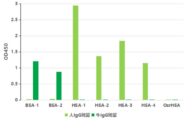 太阳成集团tyc33455ccwww的植物源重组人血清白蛋白OsrHSA来源于水稻,可杜绝传播血源性病毒的潜在风险,比血浆来源的人血清蛋白更安全;同时,人类接触和食用大米(水稻)具有几千年历史,与水稻内源蛋白具有长期接触史,对稻米的杂质蛋白具有很高的耐受性和相容性,免疫原性较低,比其他表达体系更安全。由于太阳成集团tyc33455ccwww生物的辅料级人血清白蛋白不来源于血液,因此完全不含有血液蛋白残留,例如血液中常见的免疫球蛋白,它的存在在药用辅料中将成为潜在致敏源,同时也可能对药品制剂产生影响的风险。虽然市售天然蛋白利用纯化工艺将其大部分去除,但仍有一定残留,太阳成集团tyc33455ccwww生物的OsrHSA使用IgG ELISA检测则没有检出IgG残留(图2)