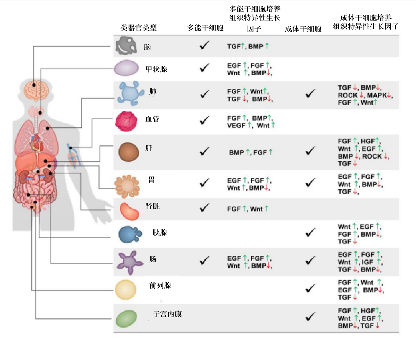 成功建立类器官的关键,除了所需的生物材料基质外,生长因子作为细胞培养、增殖及分化所必需的物质也必当优先考虑,从而保证类器官中的干细胞长期生存的能力。通过优化培养物生长条件模拟生理组织自我更新或损伤修复过程中的干细胞巢环境,如提供基底膜基质(即Matrigengel)并添加一系列激动剂(如Wnt和酪氨酸激酶受体)和抑制剂(如骨形态发生蛋白/转化生长因子-β)可达到上述目的。不同的生长因子组合也能诱导多能干细胞向不同的类器官细胞分化进而获得我们需要的类器官类型(图1),同时不同的细胞因子也是培养不同种类的类器官的关键物质(图2)。